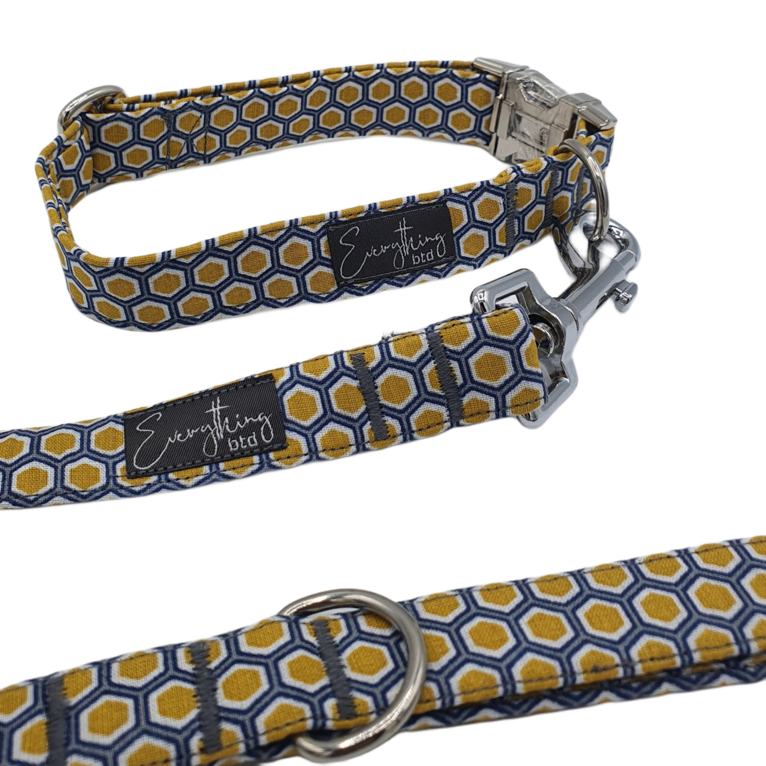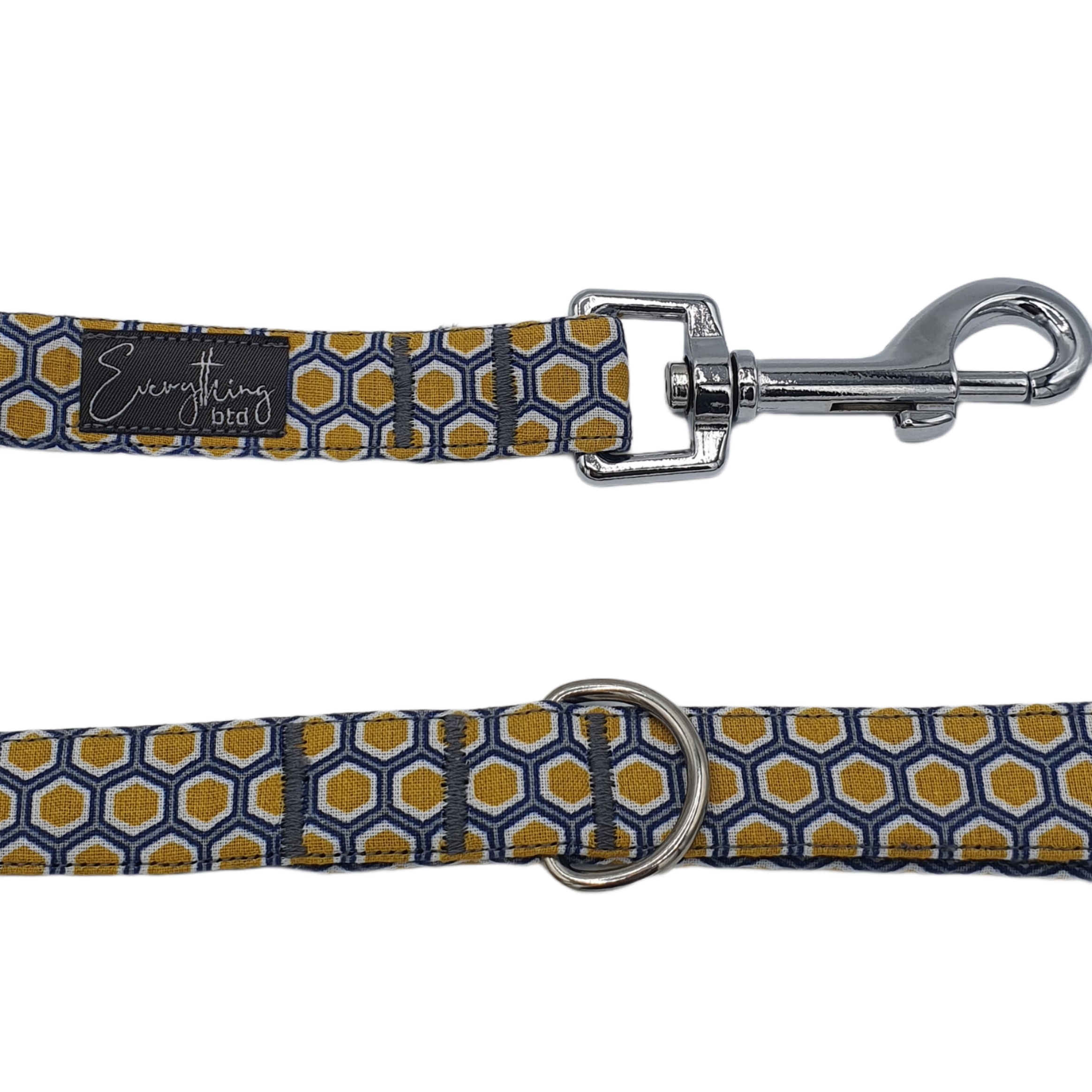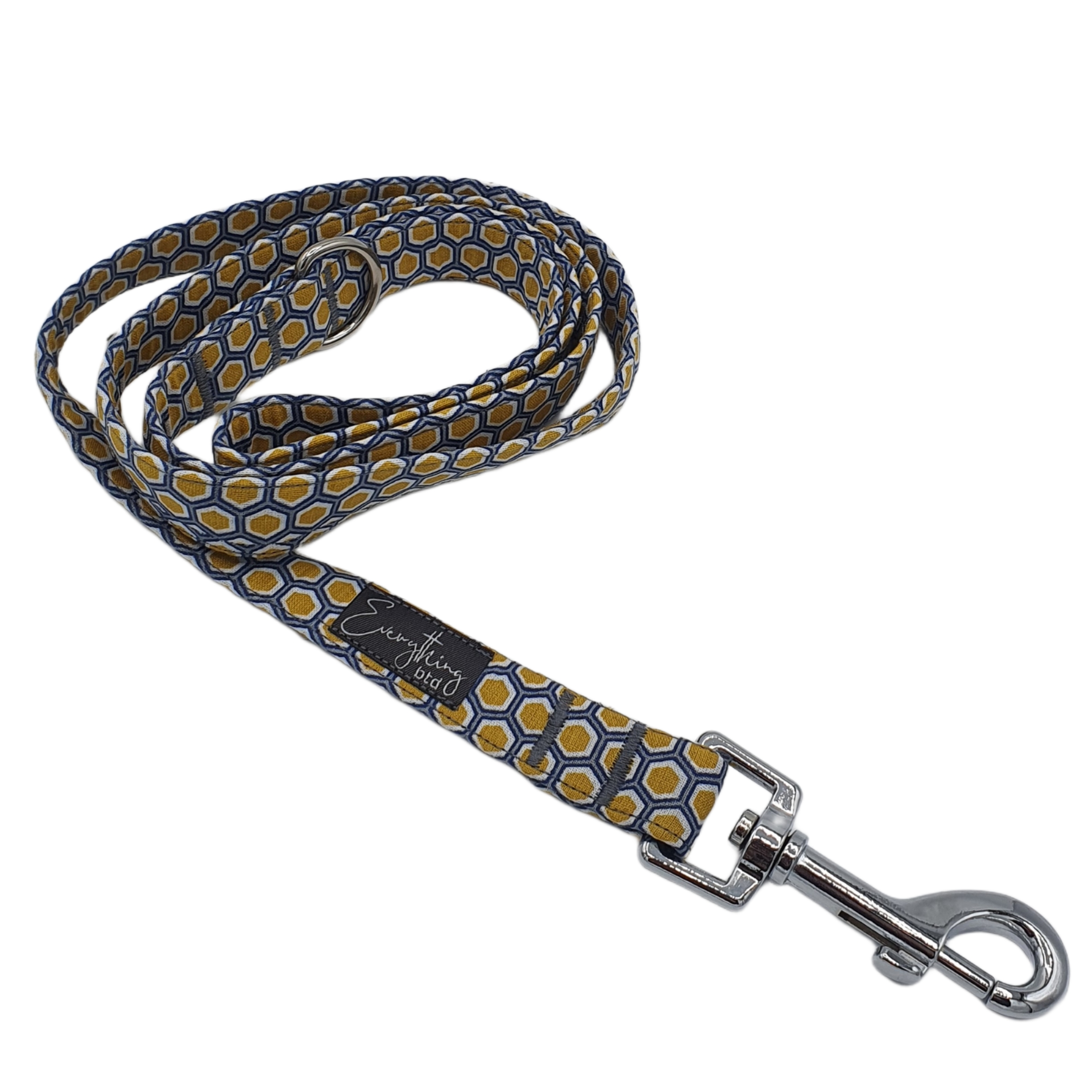 Honeycomb lead consists of honey-coloured hexagons with white highlights, outlined with navy and grey. All of our leads are handmade and have chrome hardware which gives them a luxurious feel. On the lead there is a 'D' ring which you can attach a poo bag holder onto.